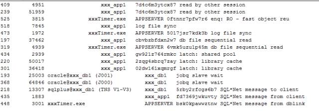 从上面的数据来看,活动会话并不是特别多,不到50个,加上后台进程的数量,与操作系统中高达200的运行相比,存在不小的差异。数据库中主要有三类的非空闲等待事件,IO相关的等待如db file sequential read,database link相关的SQL*Net more data from dblink以及latch 相关的等待事件。在这三类种,通常只有latch这类等待事件才会引起CPU的利用率增加。